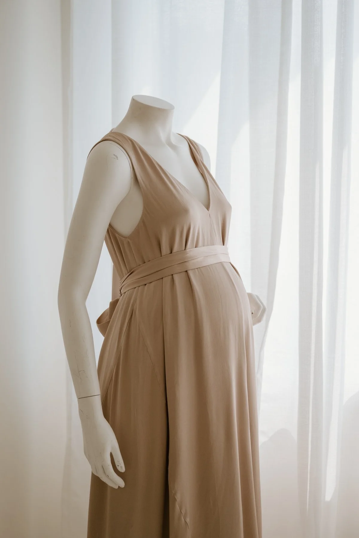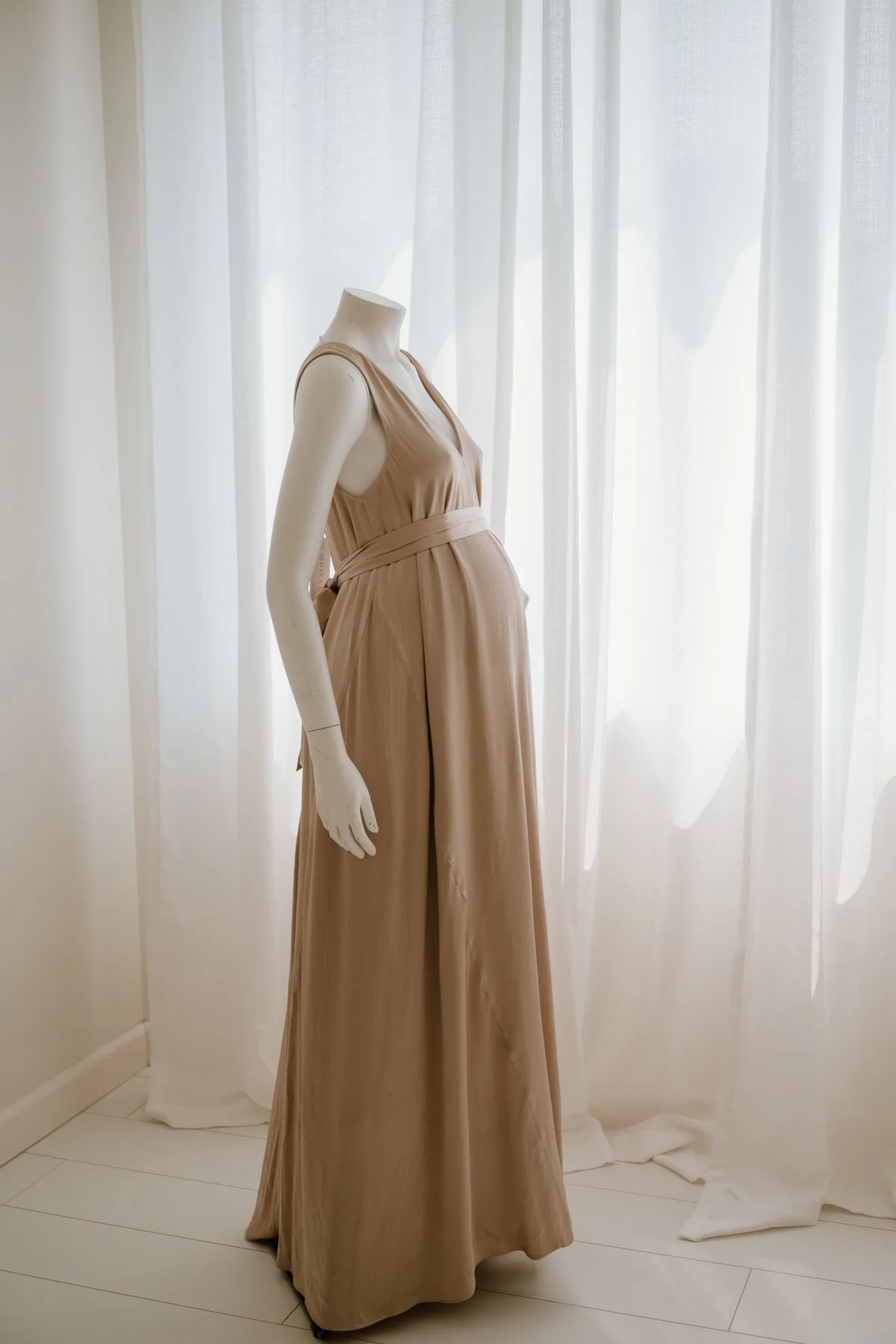 This gold La Lune scarf-panelled maxi dress is a stunning option for maternity photos. A delicate, femine, gold gown, the fabric is heavy with a silky feel and subtle sheen. The relaxed fit drapes beautifully over a growing bump, without clinging. It’s elegance with a touch of drama.