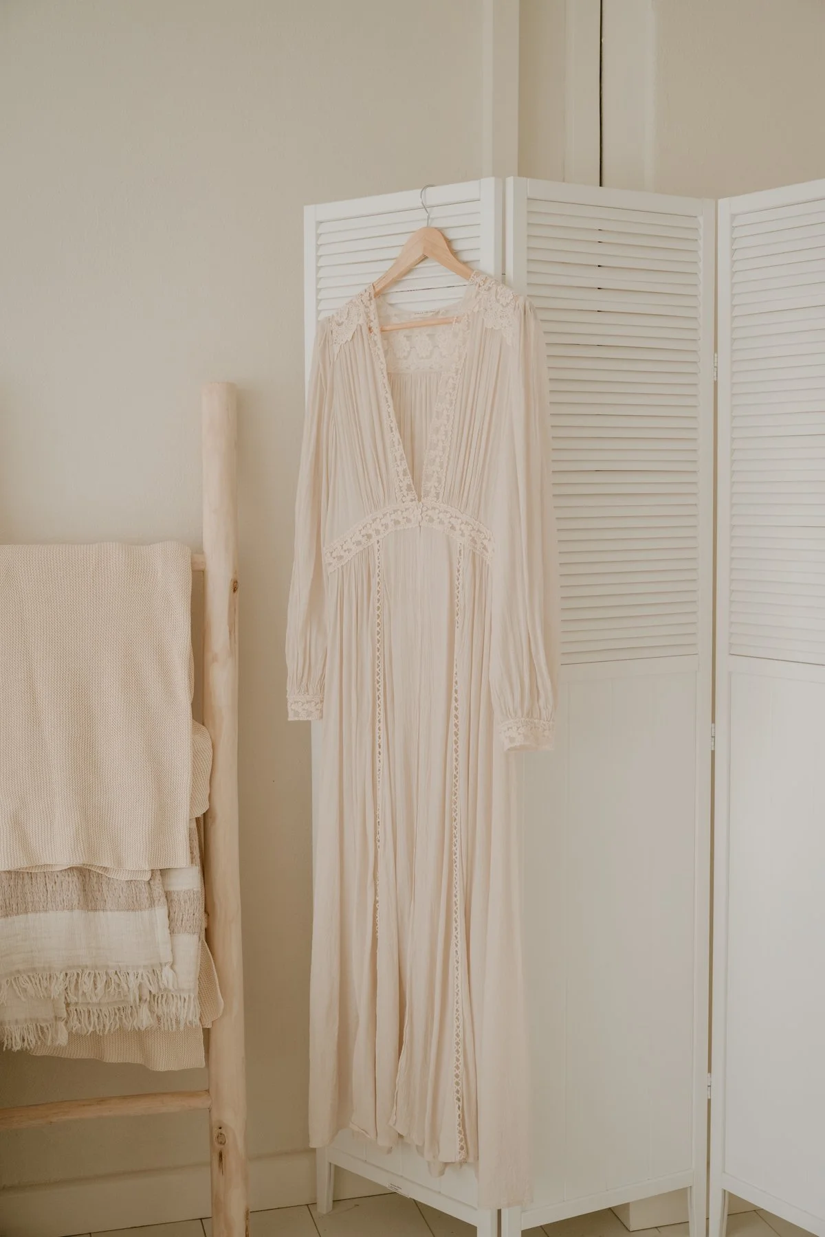 The Spell Le Gauze Lace Duster in off-white is an ethereal, bohemian-inspired maxi layering piece that adds soft, romantic texture to maternity photos. Featuring a deep V-neckline, delicate lace trim, and billowed long sleeves, this piece creates a timeless, feminine silhouette that beautifully frames a growing bump while offering effortless movement and flow in portraits. Its lightweight, lace-detailed design brings subtle elegance and dreamy dimension.